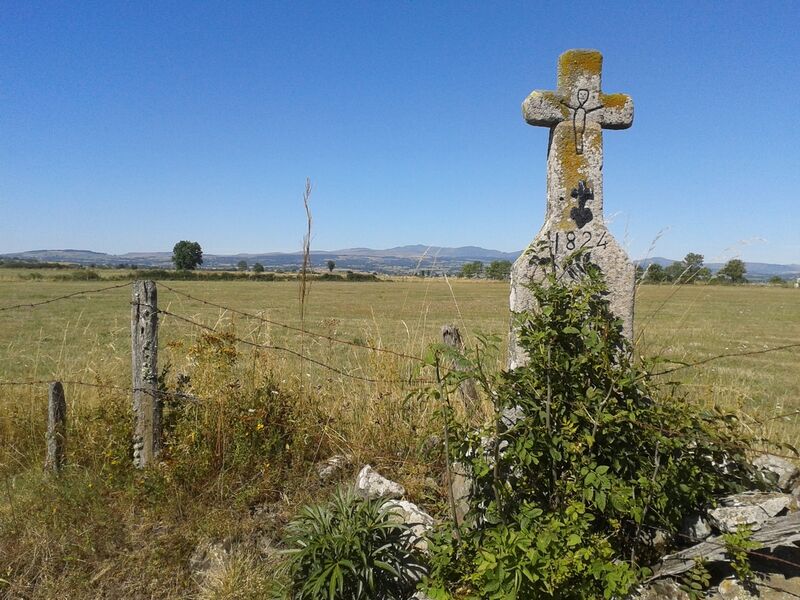 2- Rejoindre un croisement dans le village de Védernat. Prendre à droite. A la sortie, à hauteur d’une croix en pierre, continuer à droite (hors circuit vers la chapelle), puis en face ; à la fourche, tourner à droite. Hors circuit à gauche vers une cabane de berger à 300 m. Franchir une barrière métallique et avancer jusqu’à une décharge. Vue sur la vallée de la Dauzanne, la Planèze, les monts du Cantal.