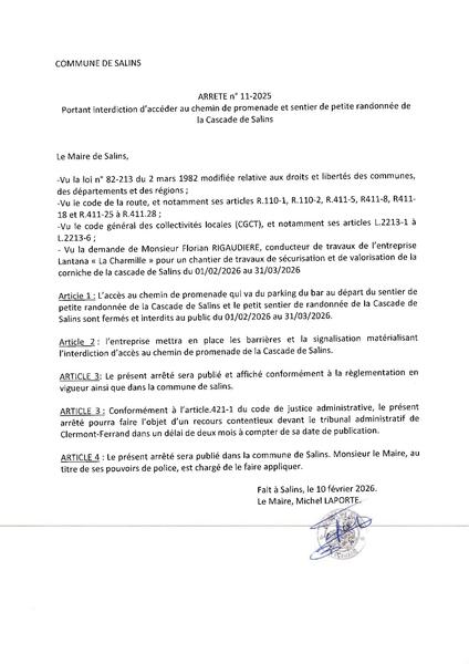 ! ARRÊTÉ PRÉFECTORAL EN COURS DU 01/02 AU 31/03/2026 POUR TRAVAUX DE SÉCURISATION ET DE MISE EN VALEUR DE LA CORNICHE DE LA CASCADE DE SALINS !