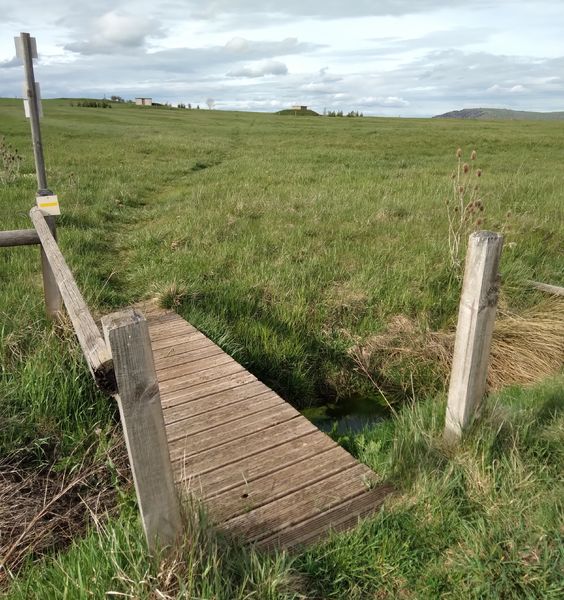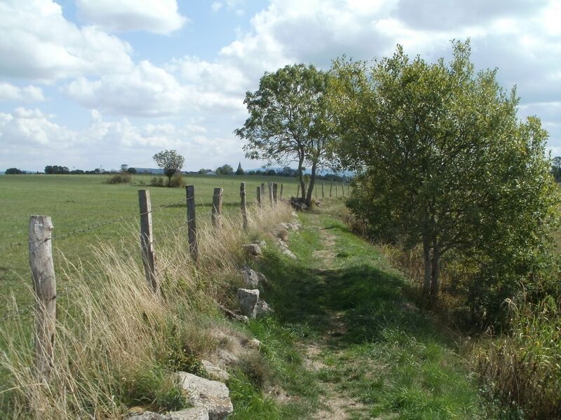 6- Passer à gauche du bâtiment, franchir une clôture et suivre le barbelé à main gauche. Continuer sur un chemin. Au carrefour en «T», prendre à gauche. Peu