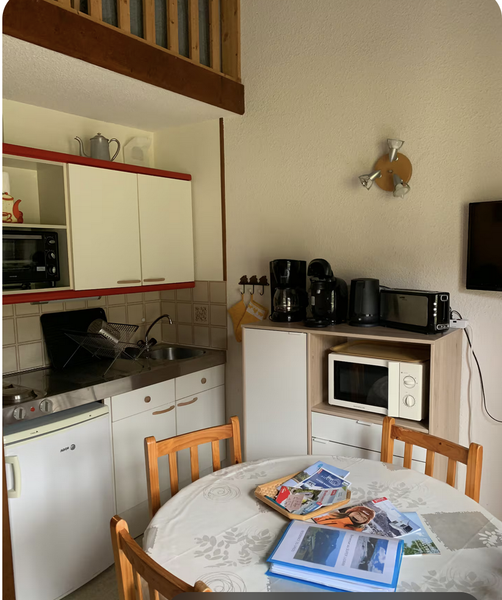 Un coin cuisine : vaisselle, ustensiles de cuisine, table, chaises, réfrigérateur, plaques électriques, mini-four, four micro-onde, cafetières (filtre et Tassimo), grille-pain, appareil à raclette et à fondue, aspirateur.