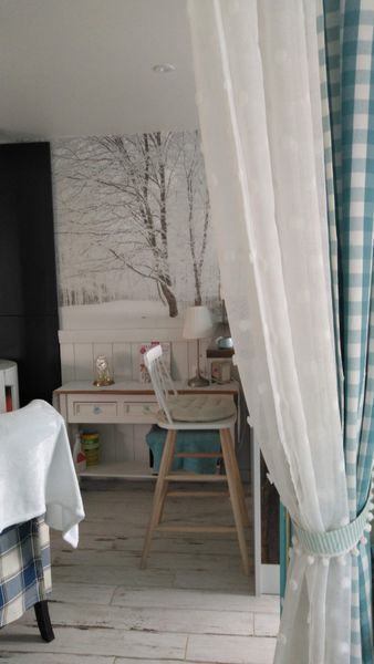 Déco bohême, tonalités douces qui rappelle le style Laura Ashley, vous pourrez vous détendre grâce à une ambiance feutrée : 1 chambre avec 1 lit de 140 x 200, cuisine équipée, salon avec deux fauteuils relax manuels. Poêle Jotul pour la saison froide. Douche italienne, pommeau hydro, WC système Boku.