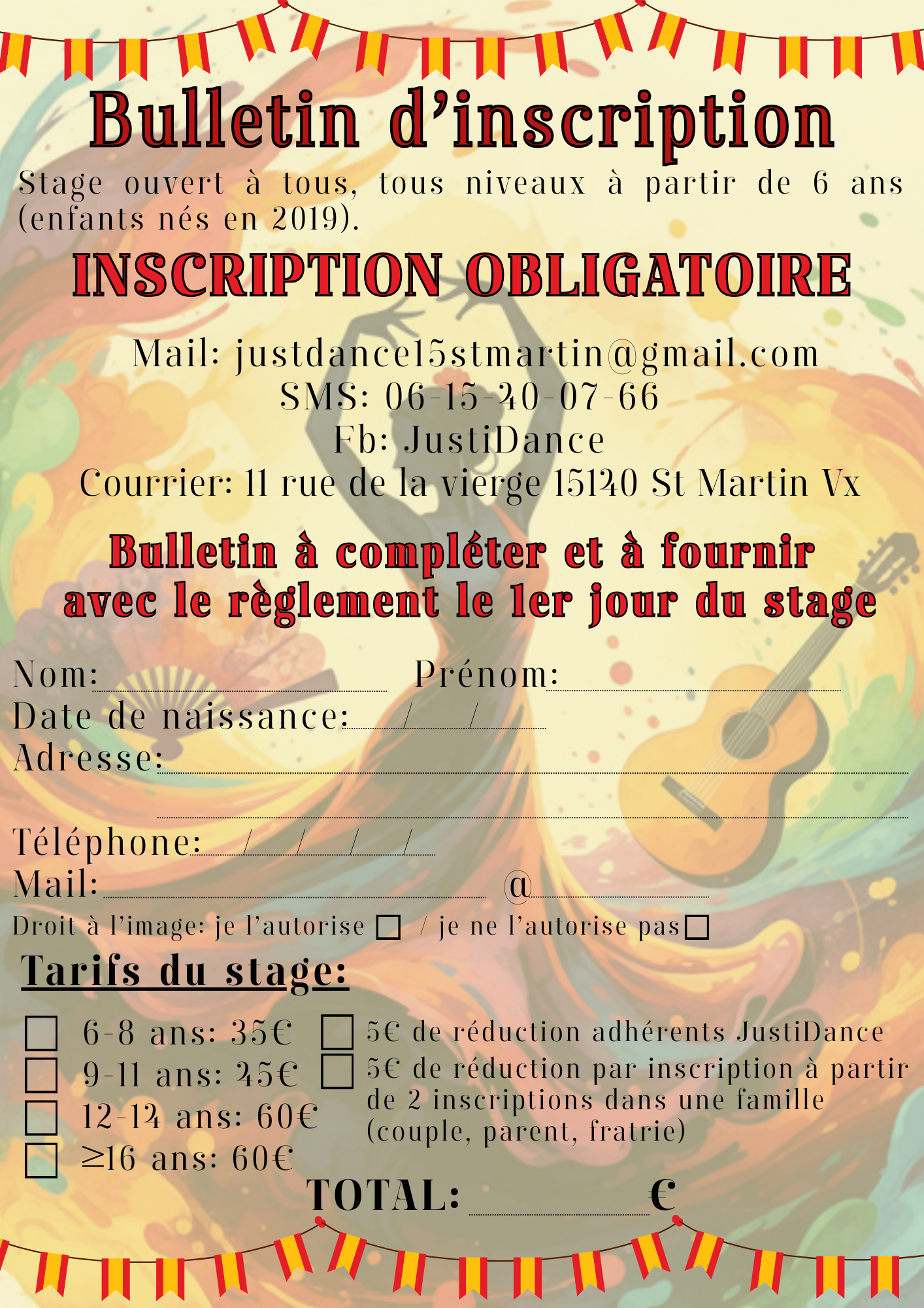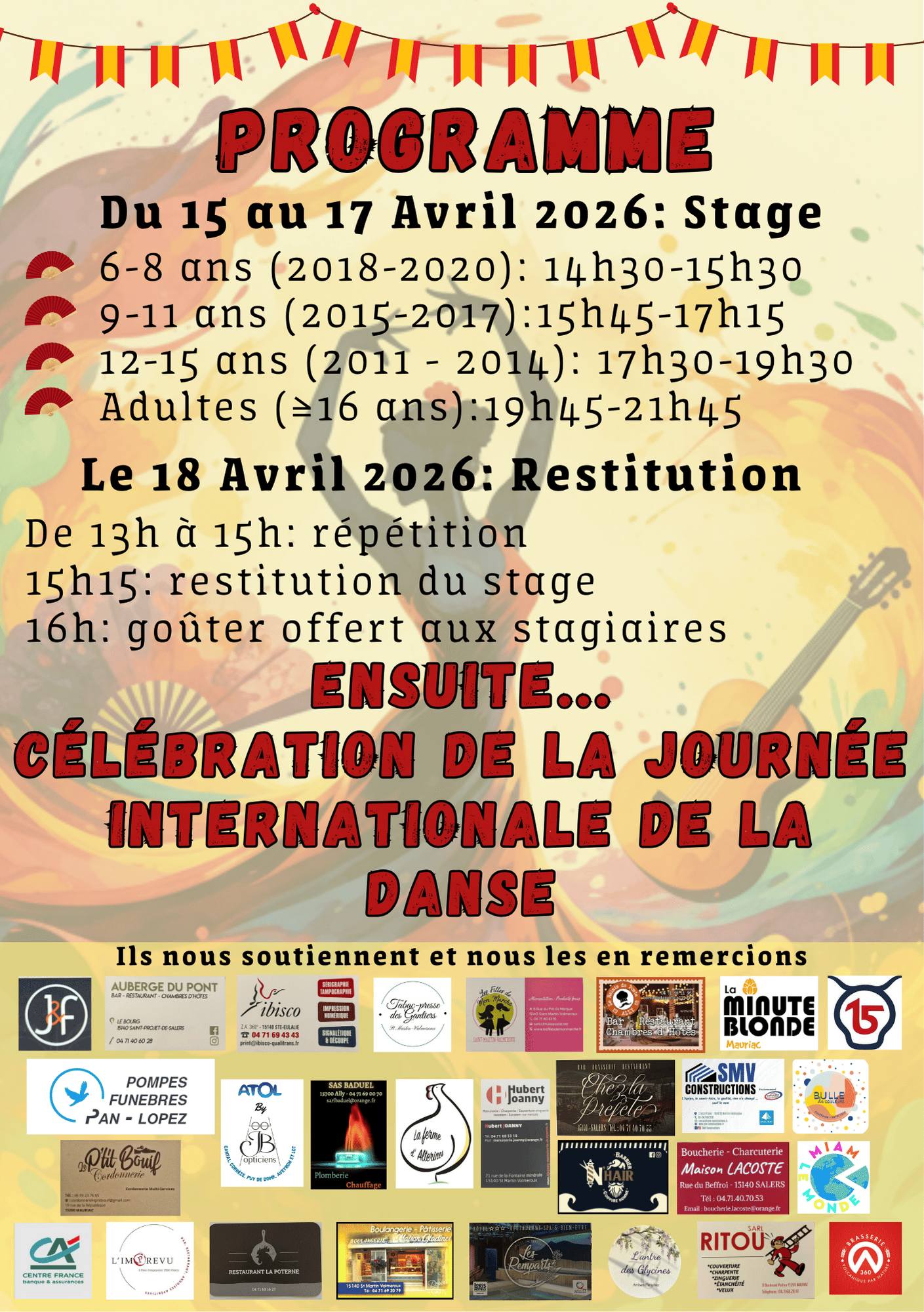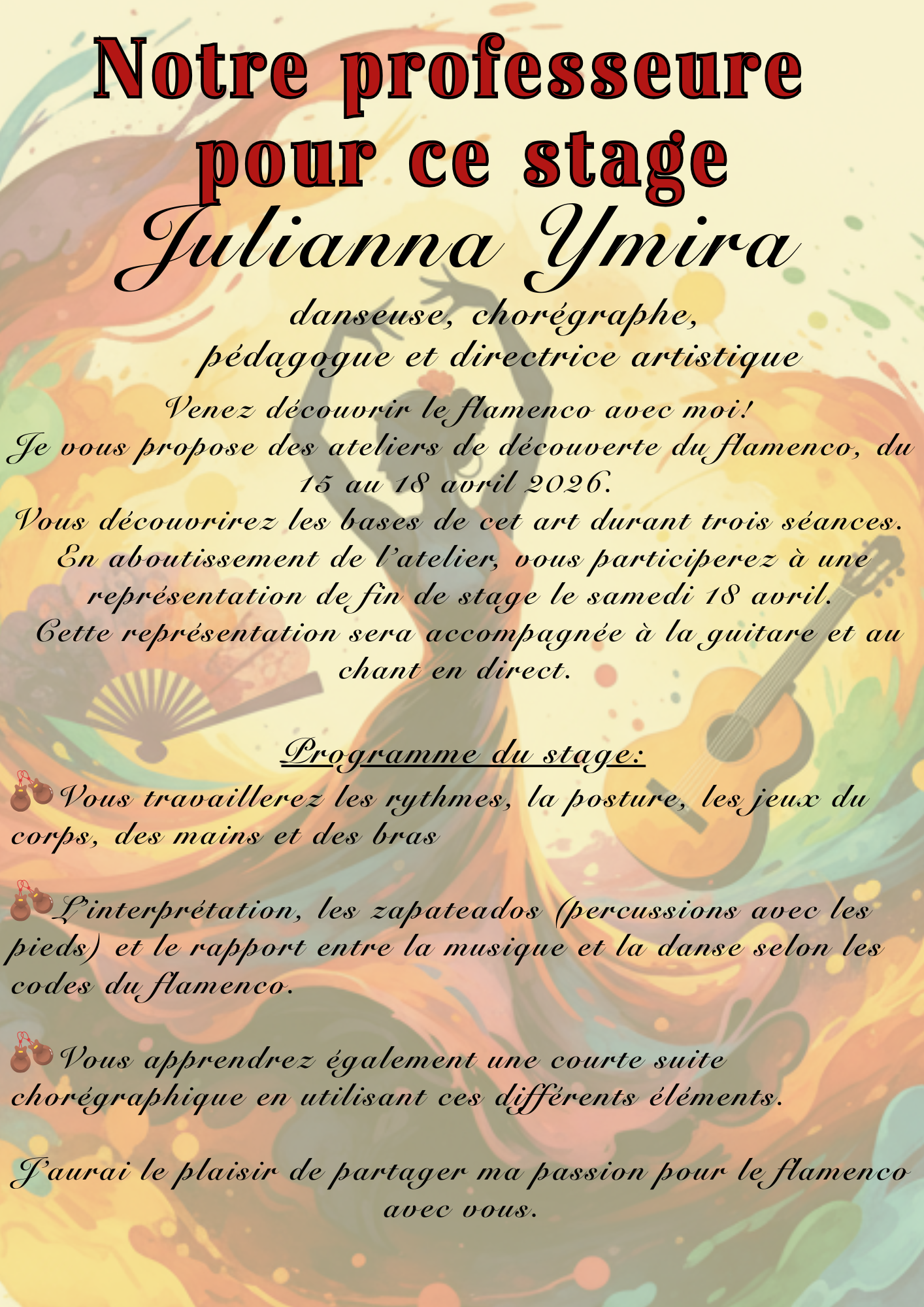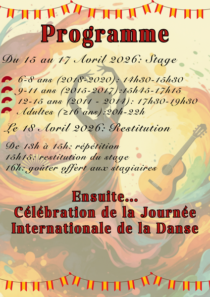 Justi Dance organise son traditionnel stage decouverte d'une danse annuel, en 2026 un stage de danse Flamenco avec Julianna Imira, sur 3 jours puis restitution publique lors de la journée internationale de la danse.