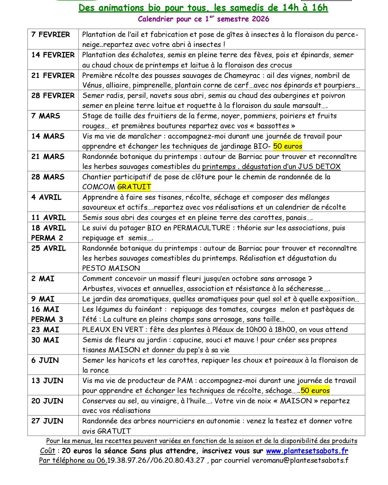 Tous les samedis, Véronique et Emmanuel, producteurs BIO à Barriac les Bosquets dans le Cantal vous accueillent sur leur ferme PLANTES ET SABOTS pour une activité en lien avec les saisons, jardinage, récolte et transformation, randonnée, cuisine sauvage.