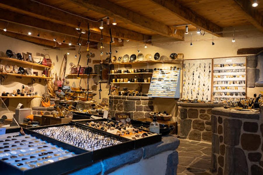 Dans sa boutique : des assiettes, des cuillères à salade, des couteaux à beurre, des boucles d’oreille, des vases, des peignes mais aussi de la corne, à l’état brut.