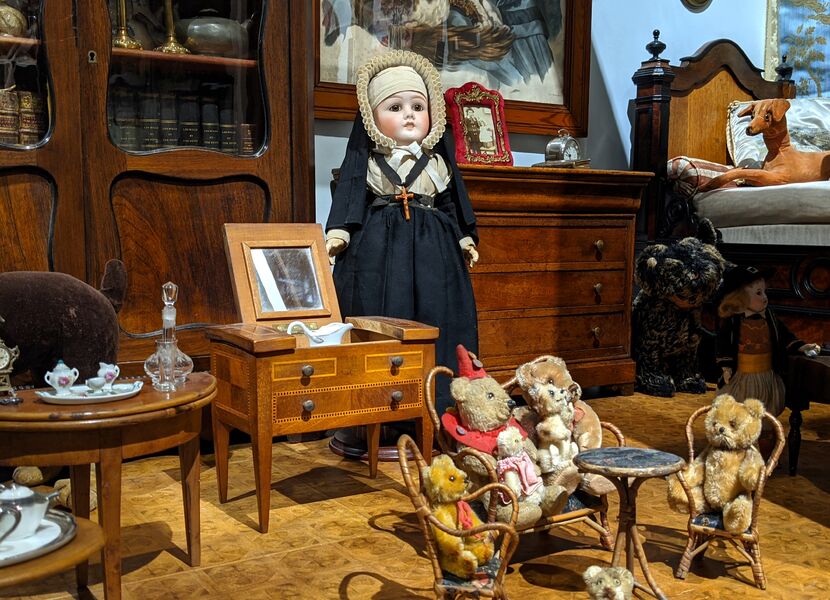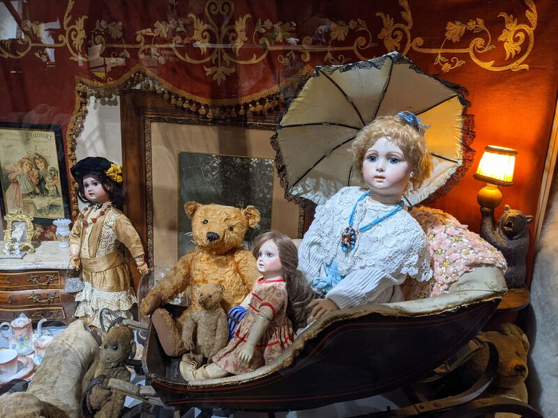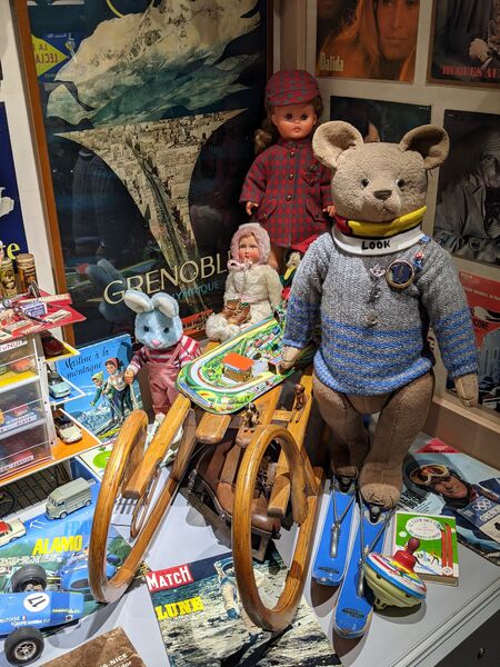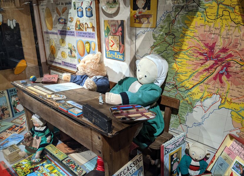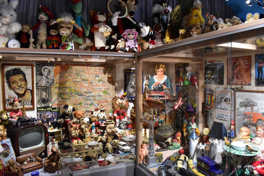 Peluches, poupées de 1900 à nos jours sont mises en scène avec des meubles de maîtrise, des jouets anciens rares, des voitures à pédales, des affiches d'époque, des souvenirs des 2 guerres mondiales, des années ORTF...