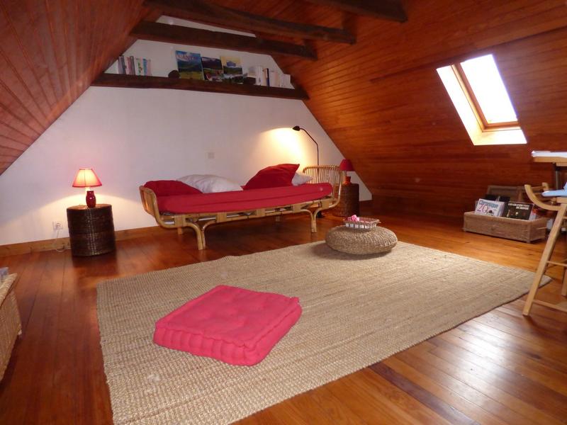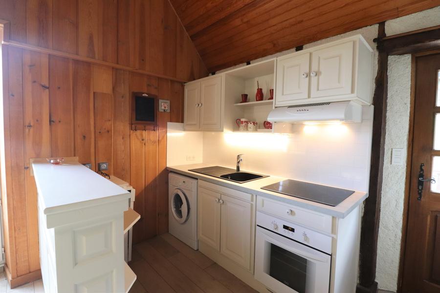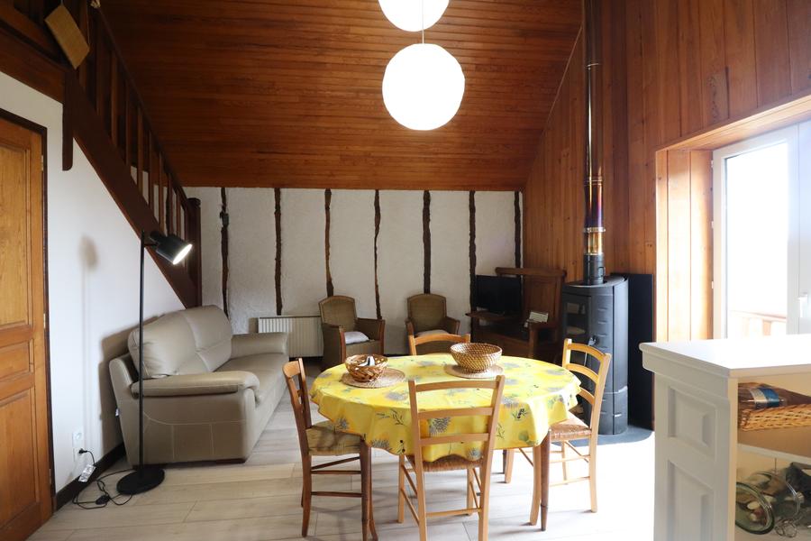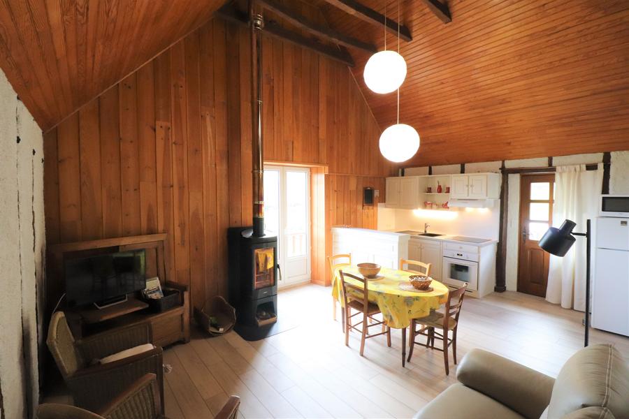 Séjour coin cuisine. 1 chambre avec 1 lit 2 personnes 160*200, 1 chambre avec 2 lits 1 personne 90*190. Salle d'eau, 1 wc indépendant. Chauffage électrique selon consommation, poêle bois gratuit. TV écran plat, Internet par la fibre ,Mezzanine à l'étage avec coin détente -lecture ,yoga . Terrain semi clos. Tarif toutes charges comprises en haute et très haute saisons.