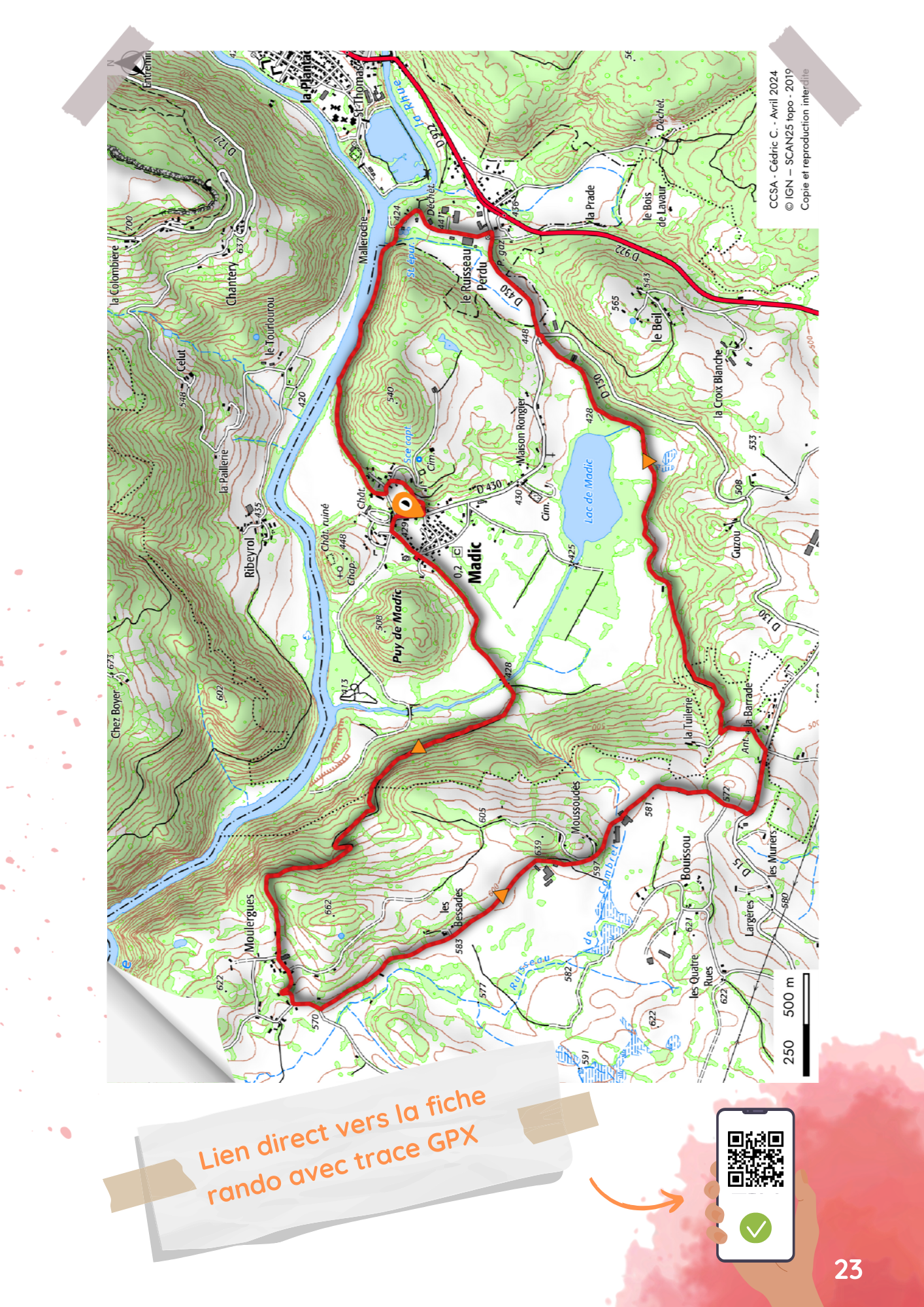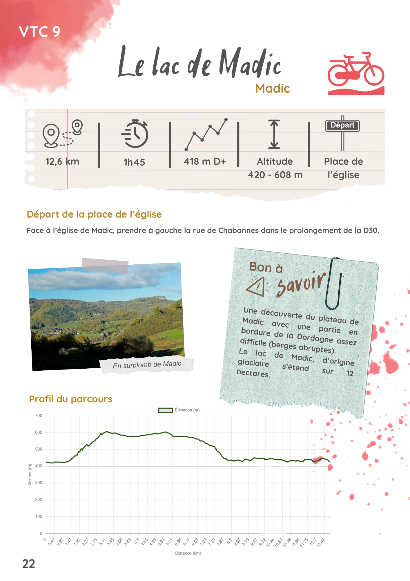 Départ au parking de l’église. Face à l’église de Madic, prendre à gauche la rue de Chabannes dans le prolongement de la D30. Au carrefour suivant (calvaire), tourner à gauche et emprunter la rue de la Dordogne sur 75 mètres, puis prendre de nouveau à gauche et s’engager rue du Stade. Continuer tout droit par la rue du Pont Boutier, dépasser l’école à main droite et poursuivre en face sur la petite route qui, après quelques hectomètres, enjambe un pont.