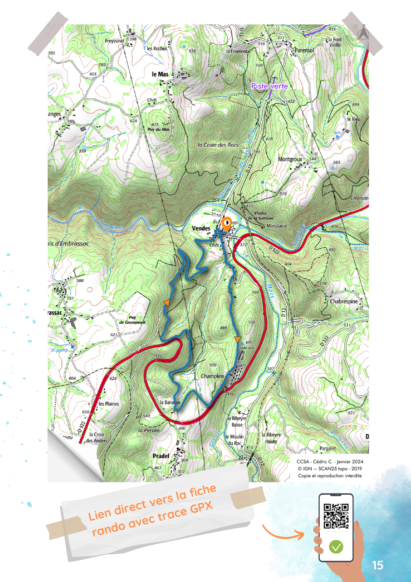 Départ au parking de l’école Louis Brousse au centre du hameau de Vendes, prendre la route de gauche en regardant l’école (à proximité chapelle du XIIème siècle)