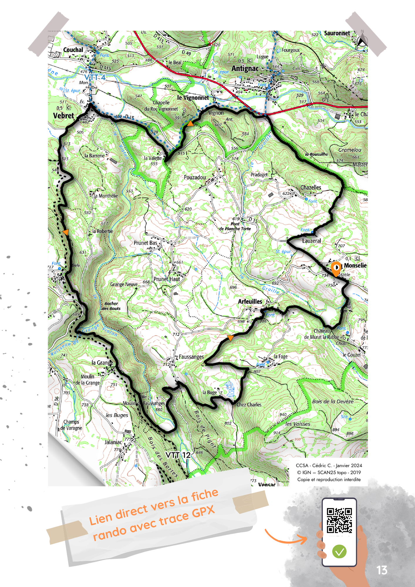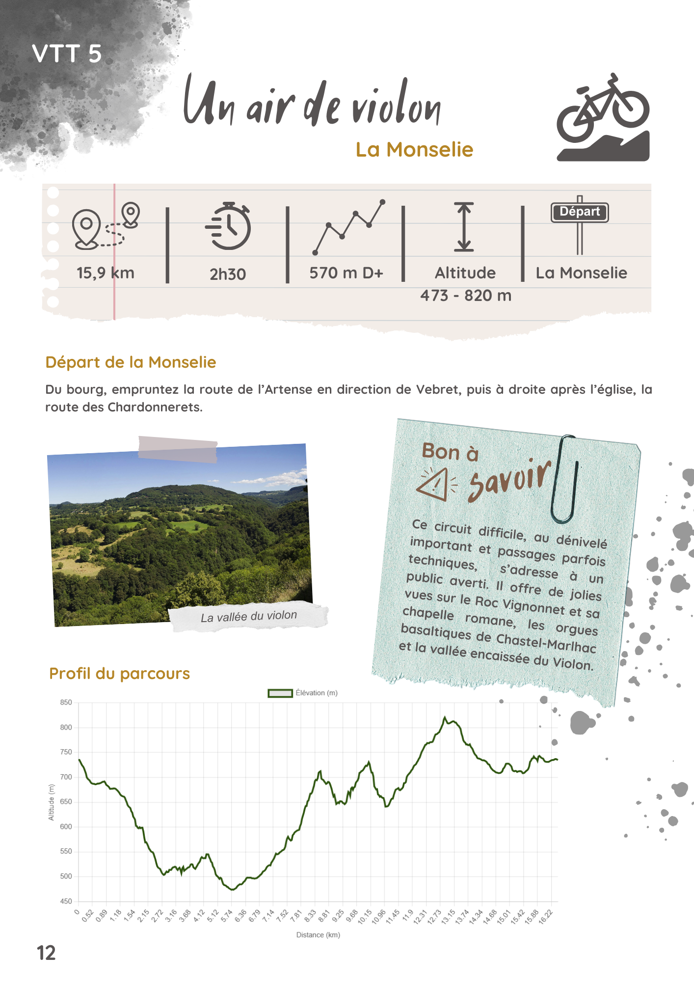Au départ de la Monselie, dénivelé et passages techniques, nécessitant parfois du partage (point rouge) font de cet itinéraire un circuit difficile destiné à un public averti. Départ également indiqué à Vebret.